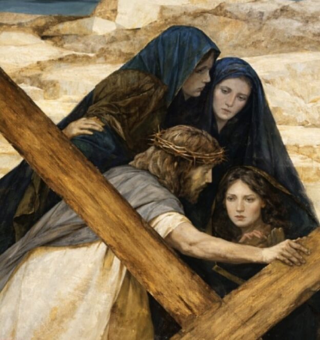 Um desses lampejos de beleza se revela quando as mulheres de Jerusalém correm ao encontro de Jesus, que passava com a cruz por aquelas ruas estreitas — ruas que, desde a sua infância, Ele conhecera tão bem e que agora o viam passar cambaleante, entre suor, sangue e lágrimas